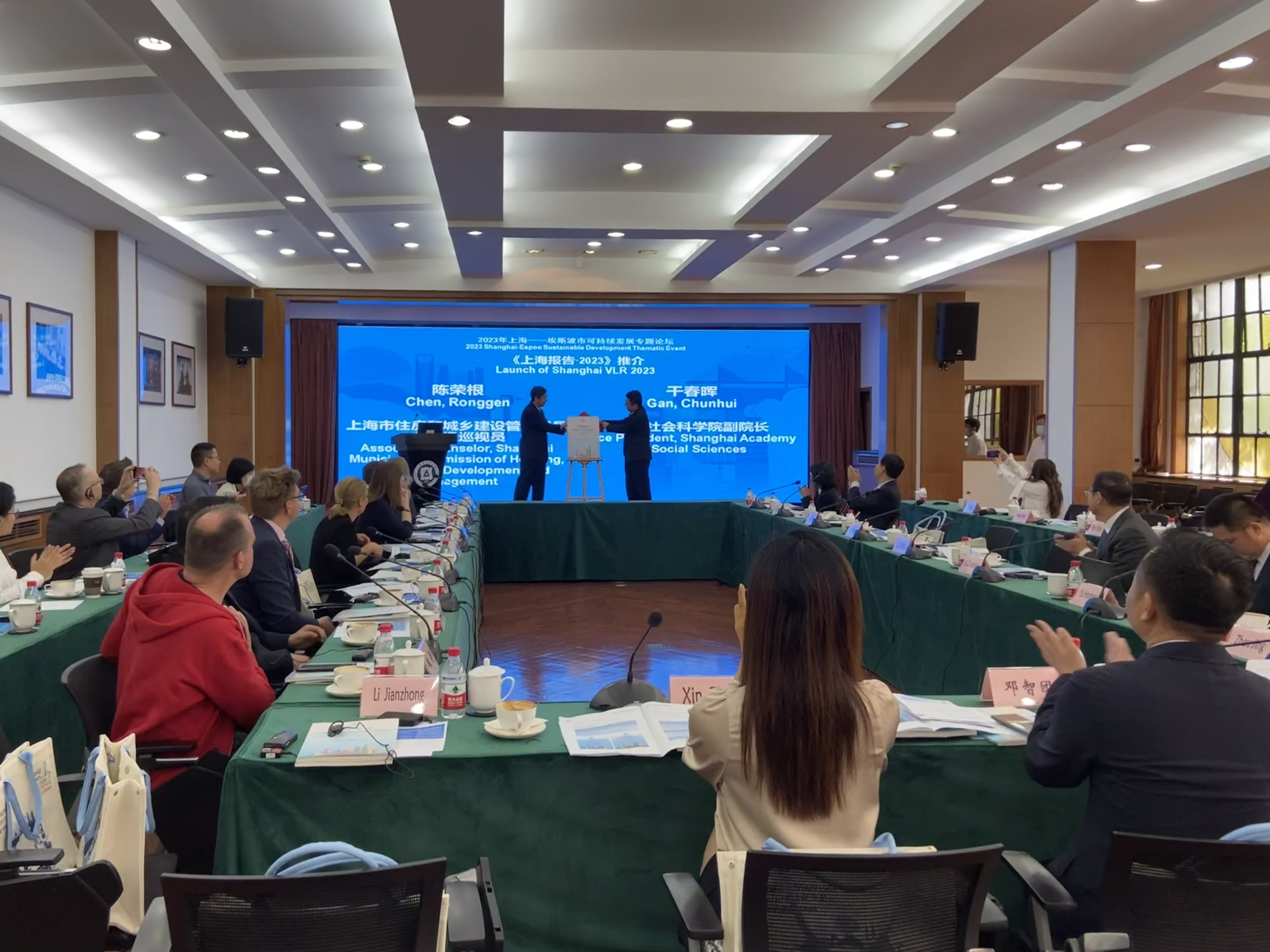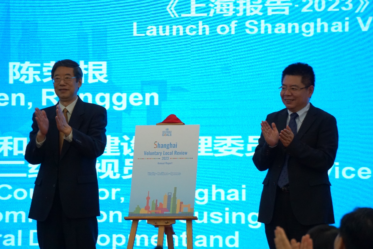 上海市住房和城乡建设管理委员会二级巡视员陈荣根和上海社会科学院副院长干春晖共同推介《上海报告·2023》。