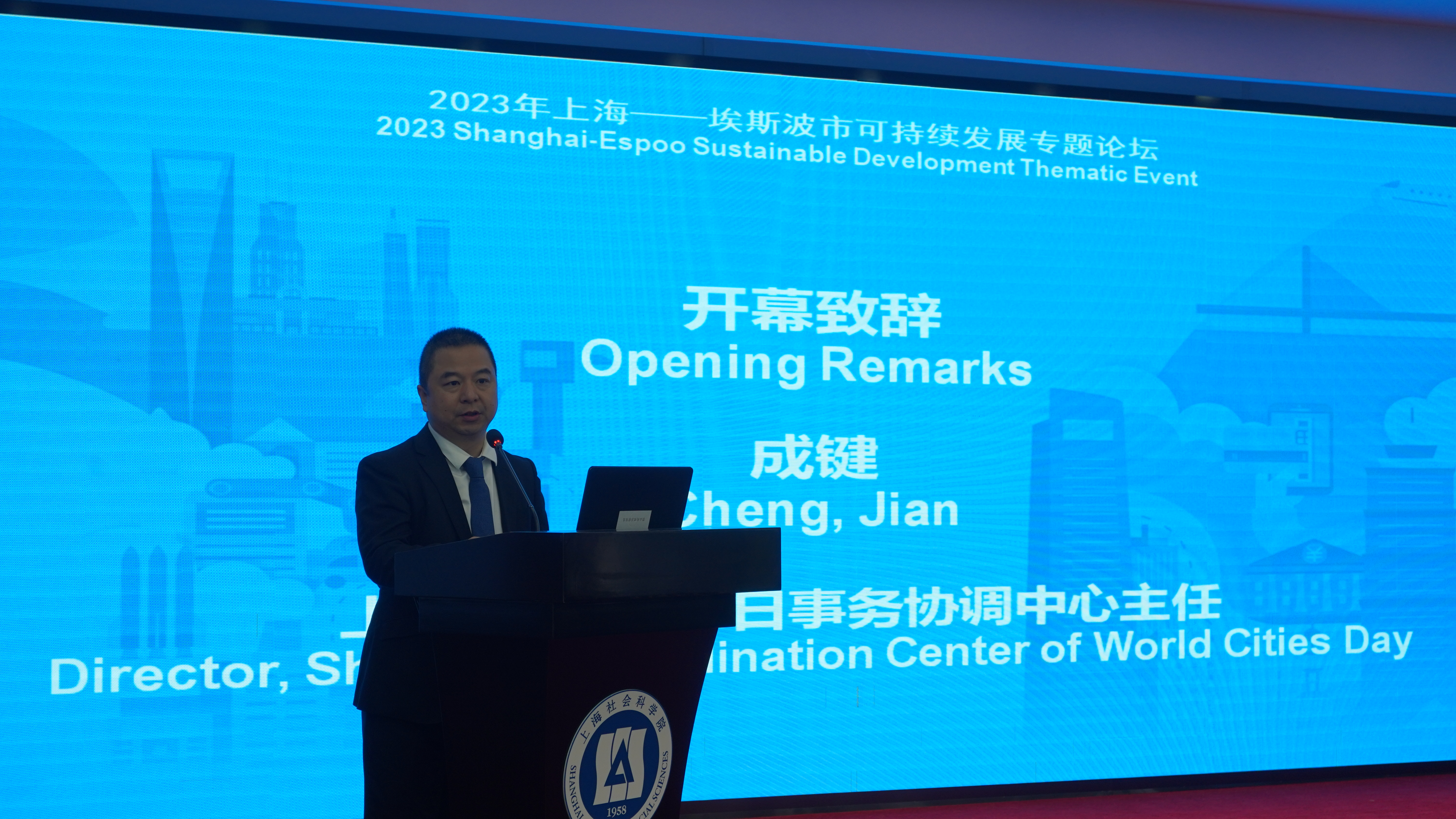 上海市人民政府外事办公室二级巡视员、欧非处处长李春平,埃斯波市可持续发展卓越中心移动与数字化发展经理玛丽·帕塔洛,上海社会科学院副院长干春晖,上海世界城市日事务协调中心主任成键作开幕致辞。