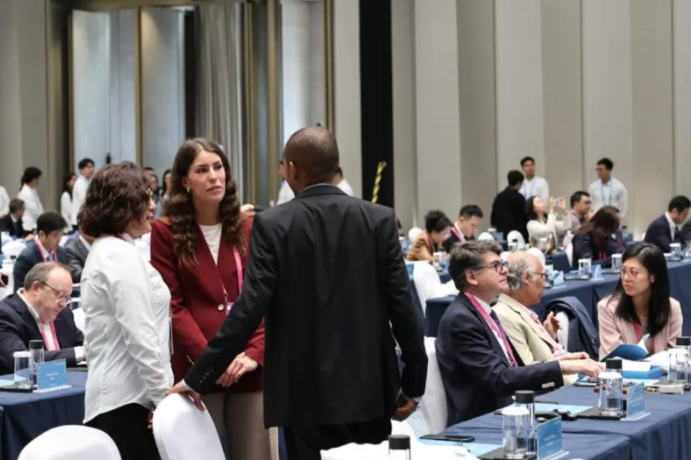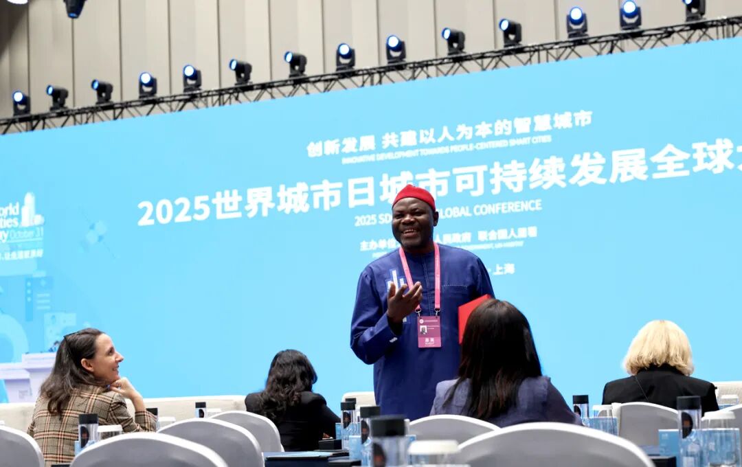 在上海市举办的2025世界城市日城市可持续发展全球大会全体大会上,与会嘉宾在会议厅内进行交流。